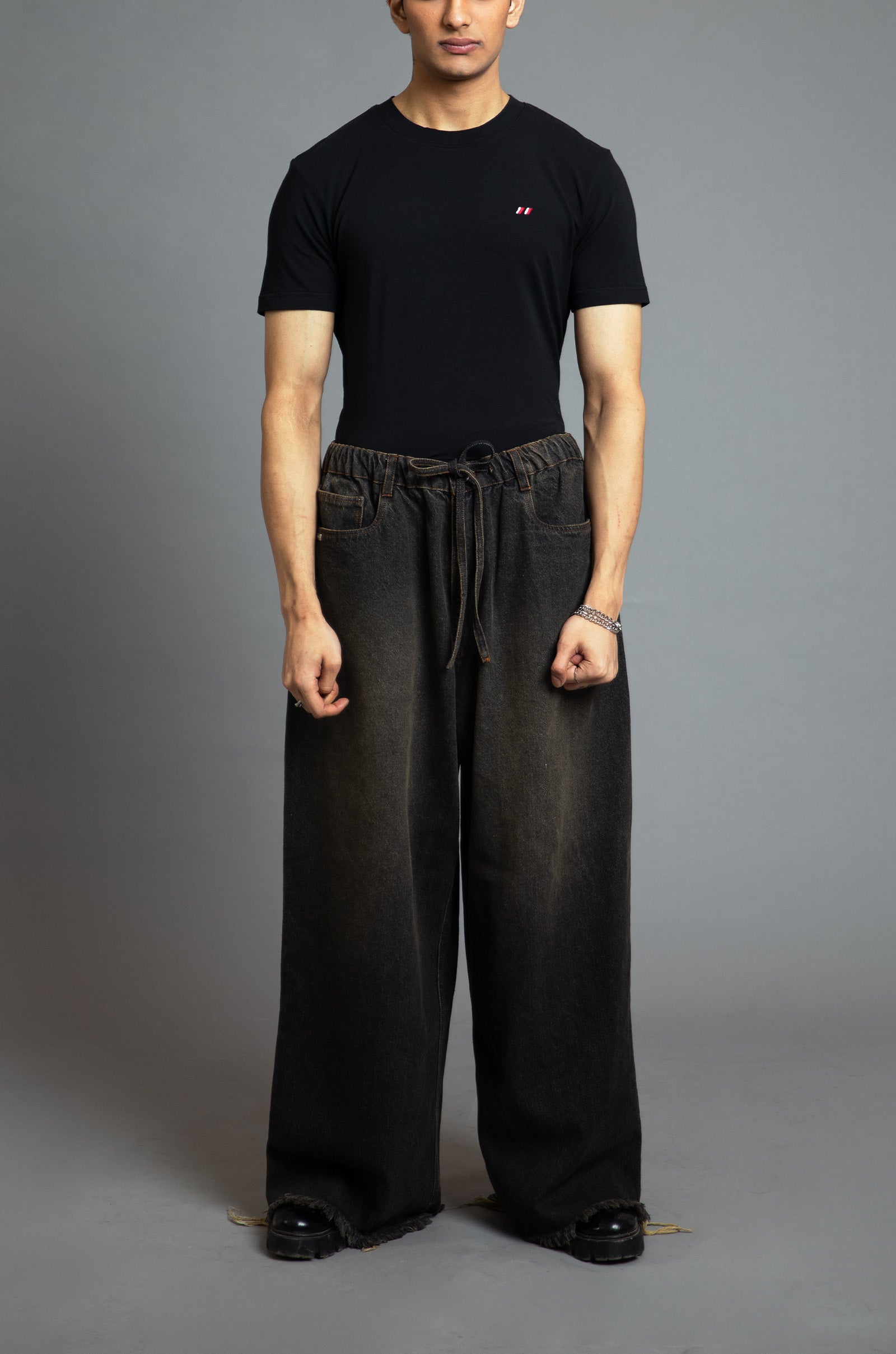 Soft-washed, 100% cotton, unisex denim with a light faded finish. Baggy fit. Dropped crotch for unrestricted movement. These jeans feature a raw, distressed hemline and an additional adjustable drawstring detailing at the waist.