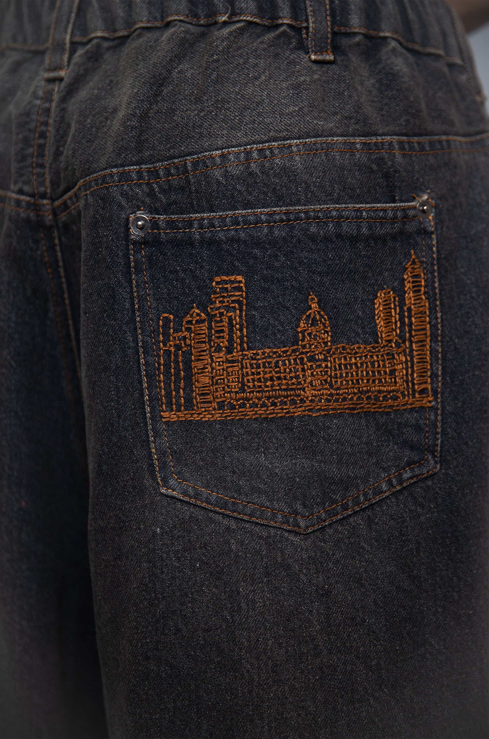 The back features two machine-embroidered pockets with 'A shot of Mumbai' Skyline silhouette; A distinct feature of the entire capsule.