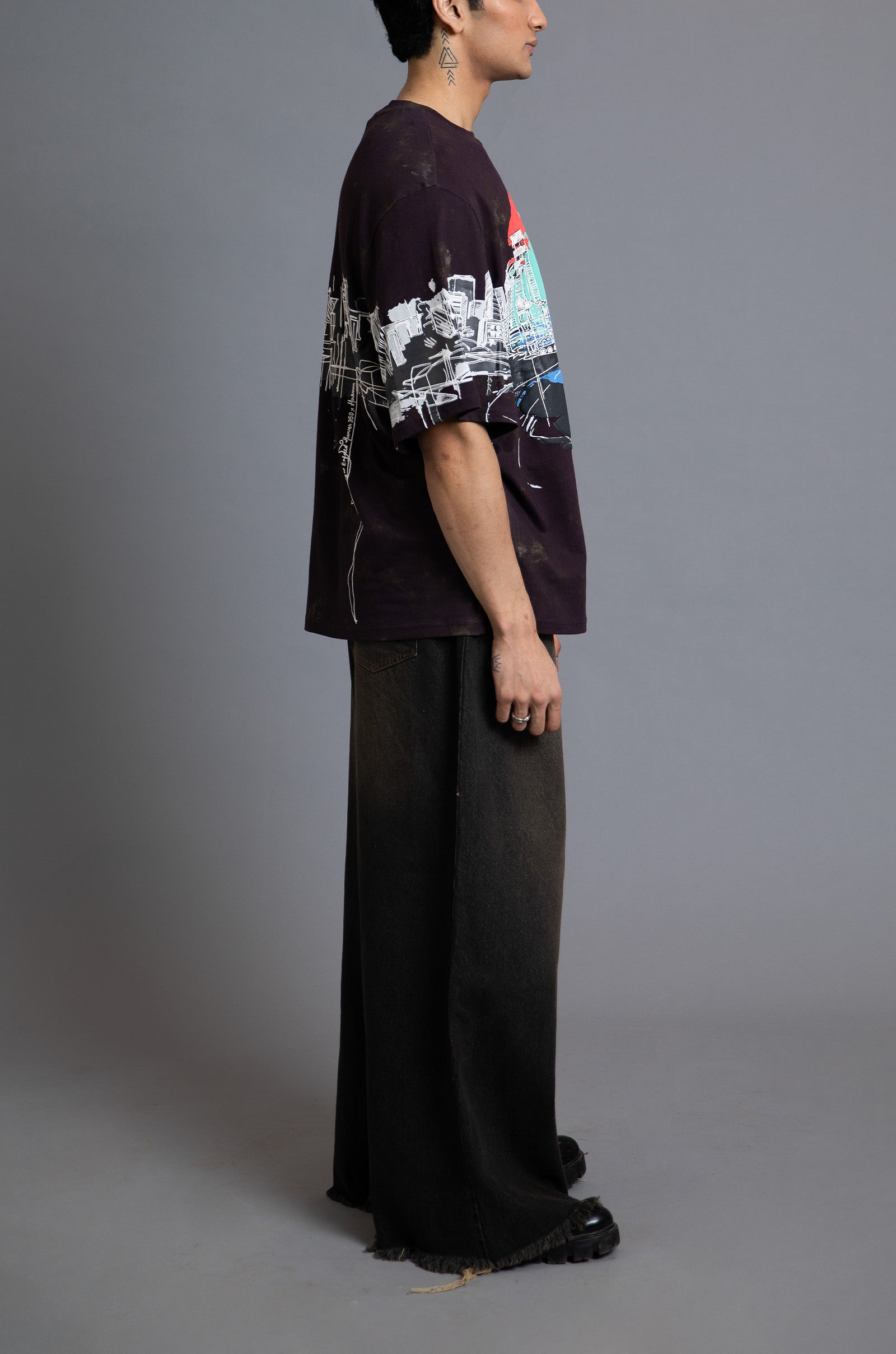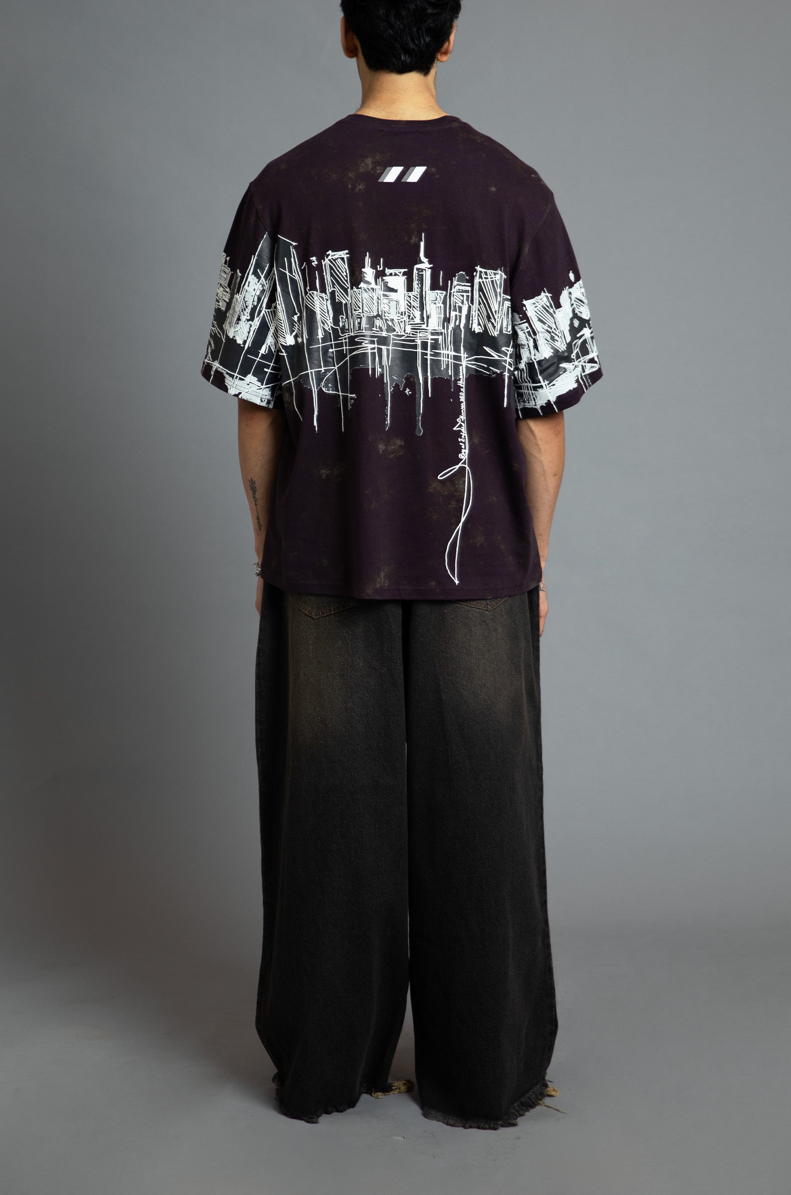 Created using a water-based screen-printing technique with 3D rubberized elements, over a digitally printed glitched dark purple effect. The print offers a unique tactical experience.