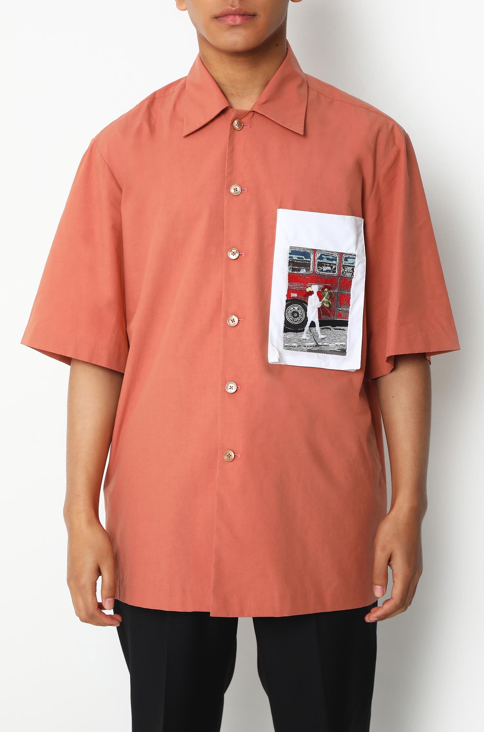 100% cotton poplin, unisex safari shirt with handcrafted box pocket of original Huemn art.