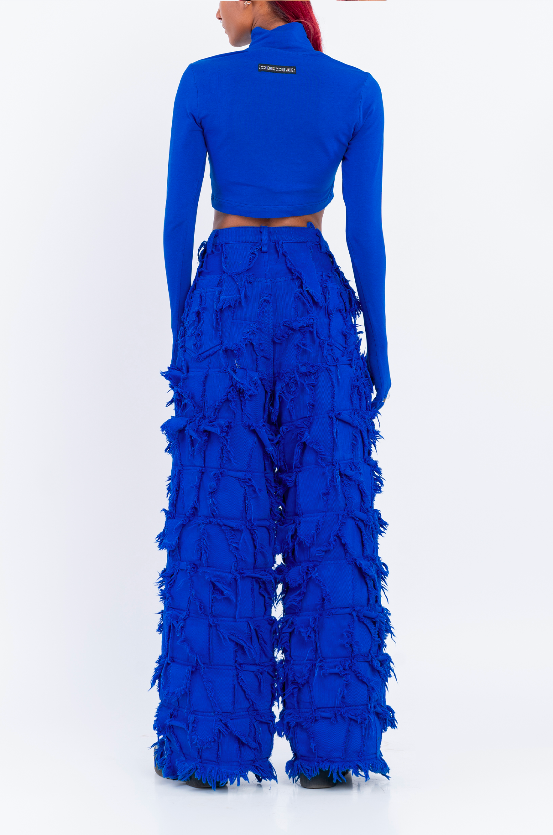 Turtleneck crop top in the classic HUEMN second skin silhouette, but featuring a gloved sleeve in the HUEMN blue.