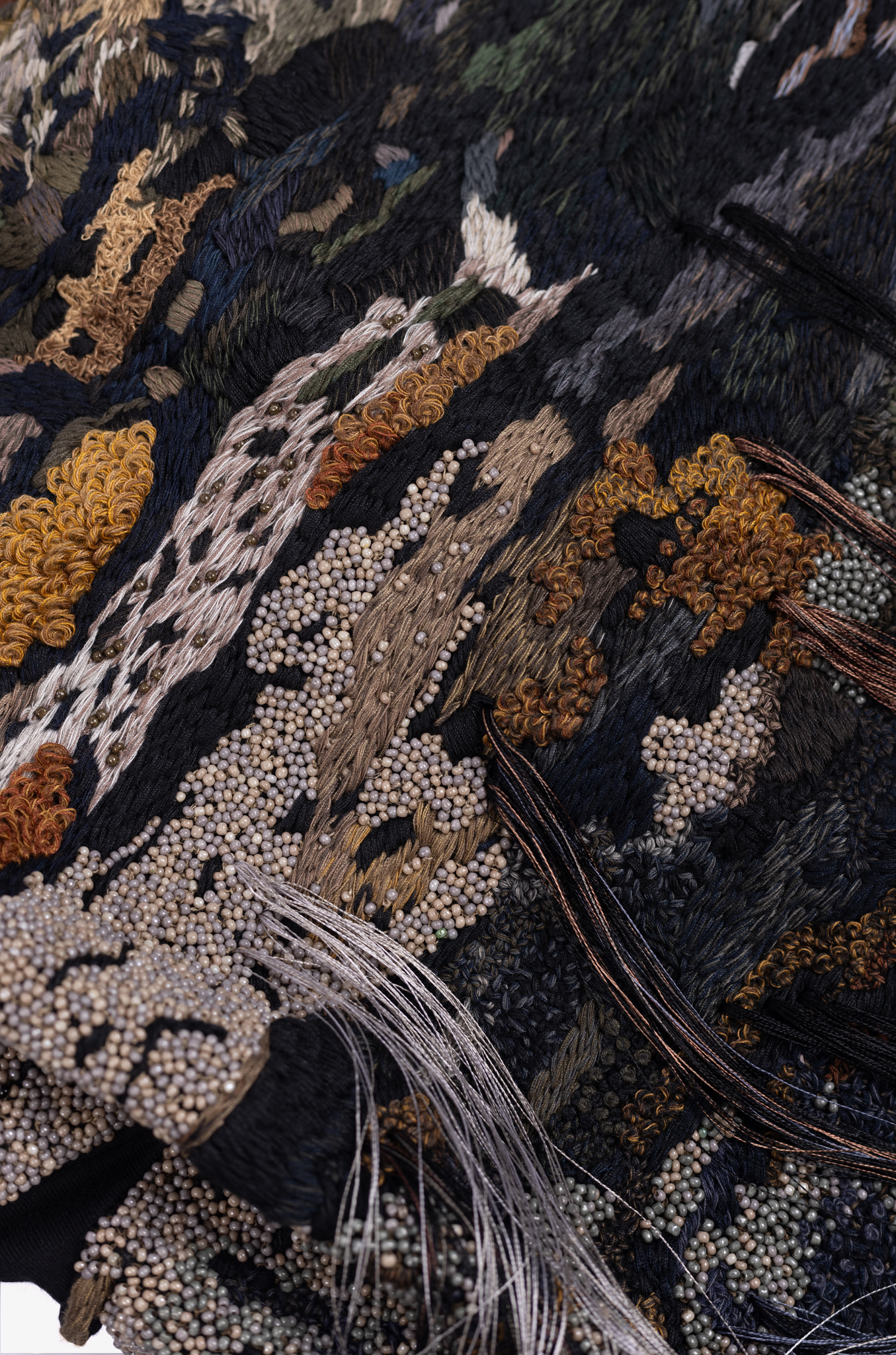 The 'Scandinavian house' embroidery work on the entire front panel is done with thousands of beads and hand-embroidered stitches made with multi-colored threads in over 180 man-hours.