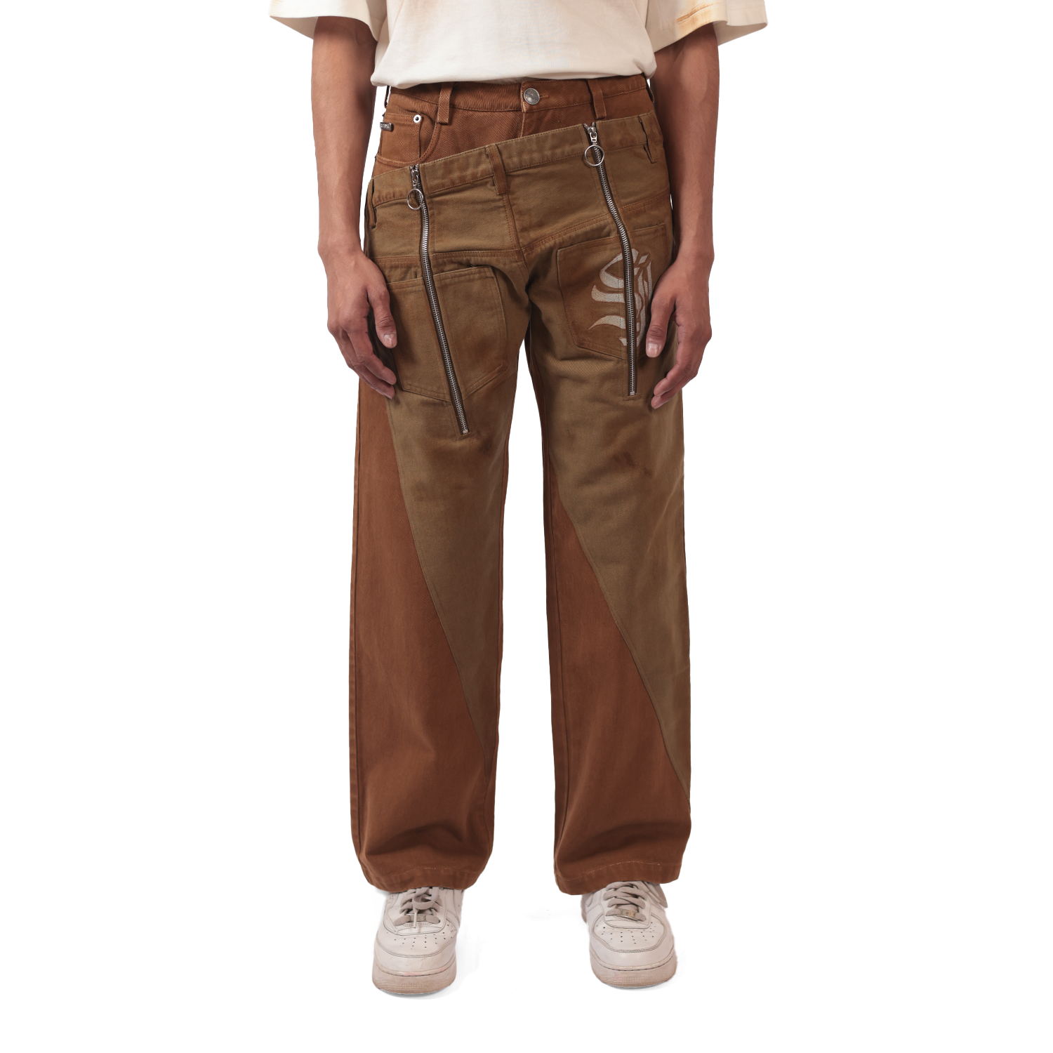 The denim front showcases a unique mud-washed surface finish, achieved through a meticulous multi-step hand-wash process, where each layer is carefully hand-painted.