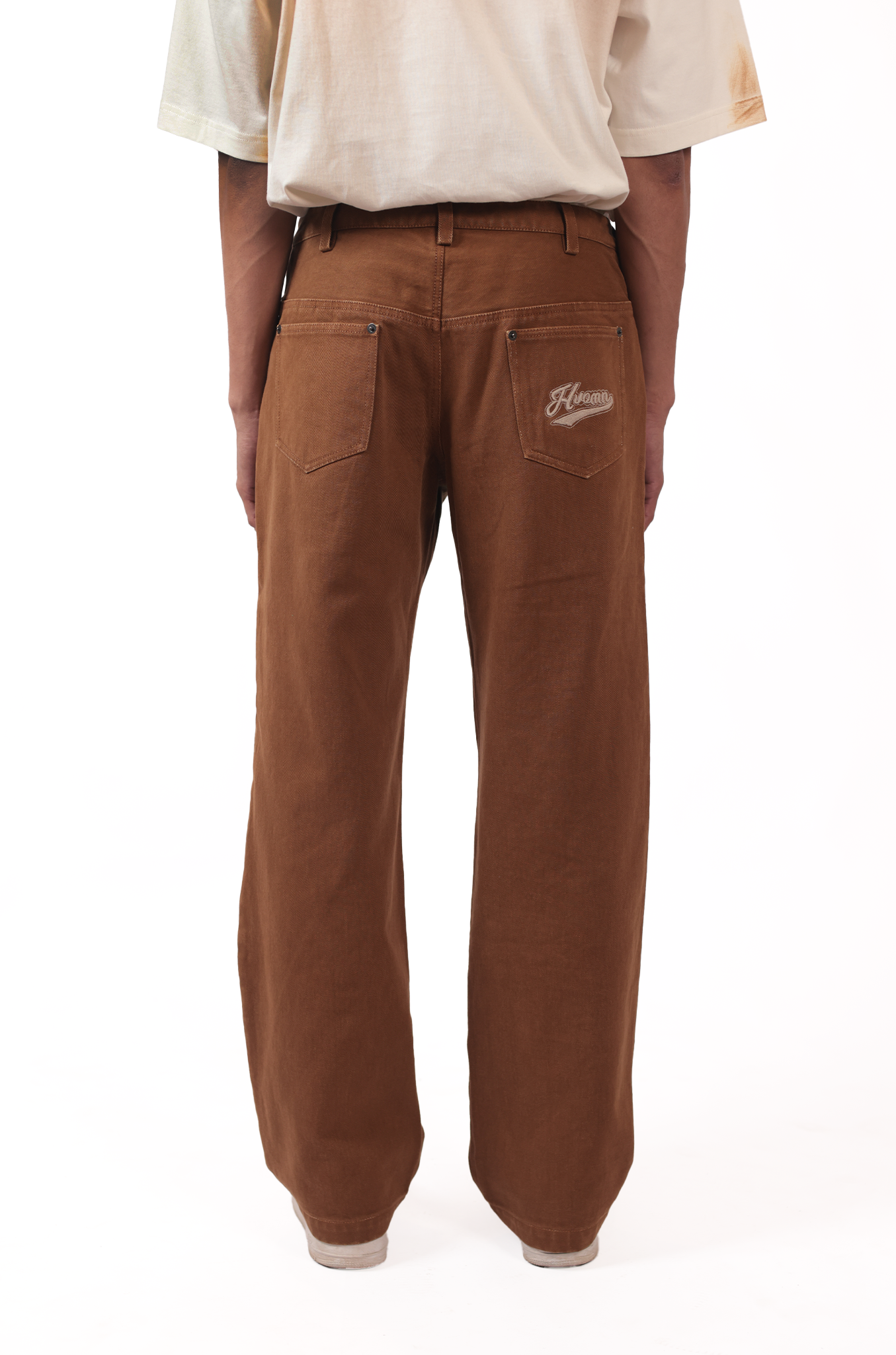 These jeans feature layered and washed two-tone de-constructed panels, embroidered 'SI' graphic and a retro HUEMN logo.