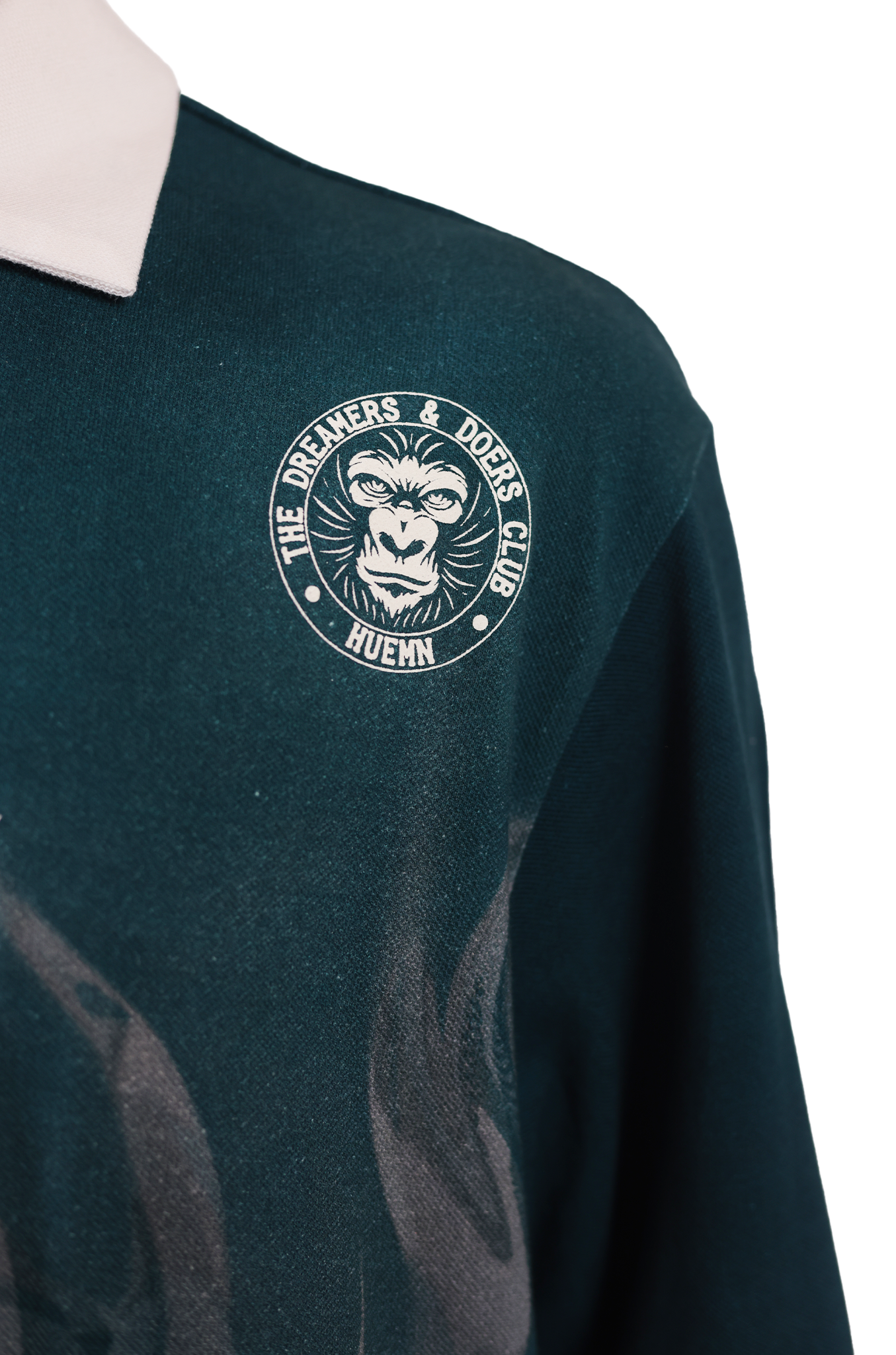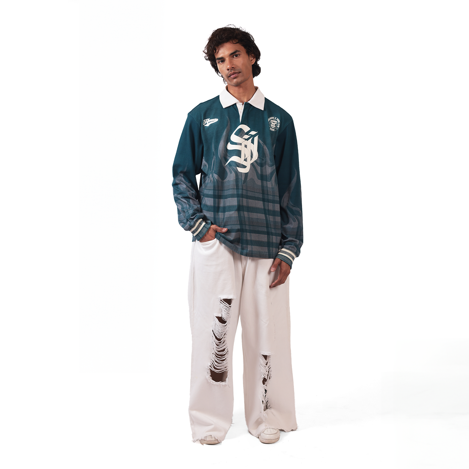 Details include a polo collar, short concealed front button fastening, ribbed cuffs and straight hem. The t-shirt is finished with a 3-D water-based screen-printed signature 'SI' graphic inspired by cricket stumps, digitally printed checkered pattern and distinct HUEMN graphic details.