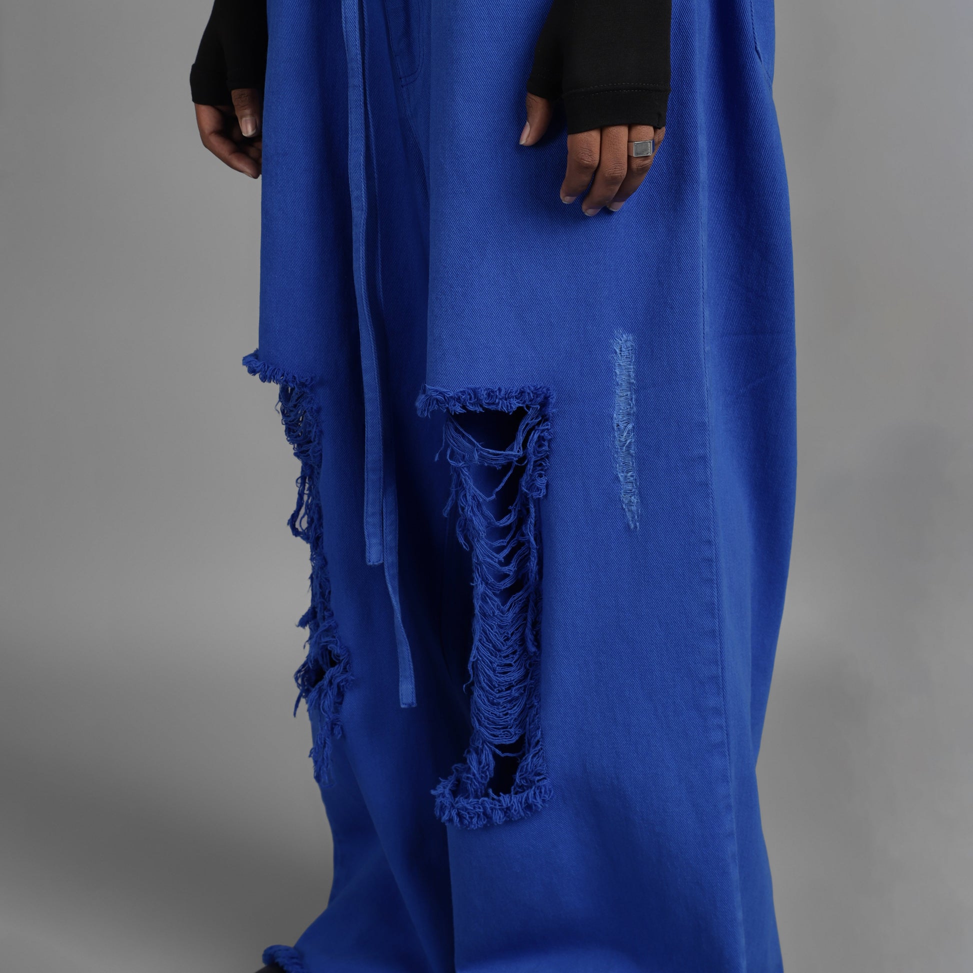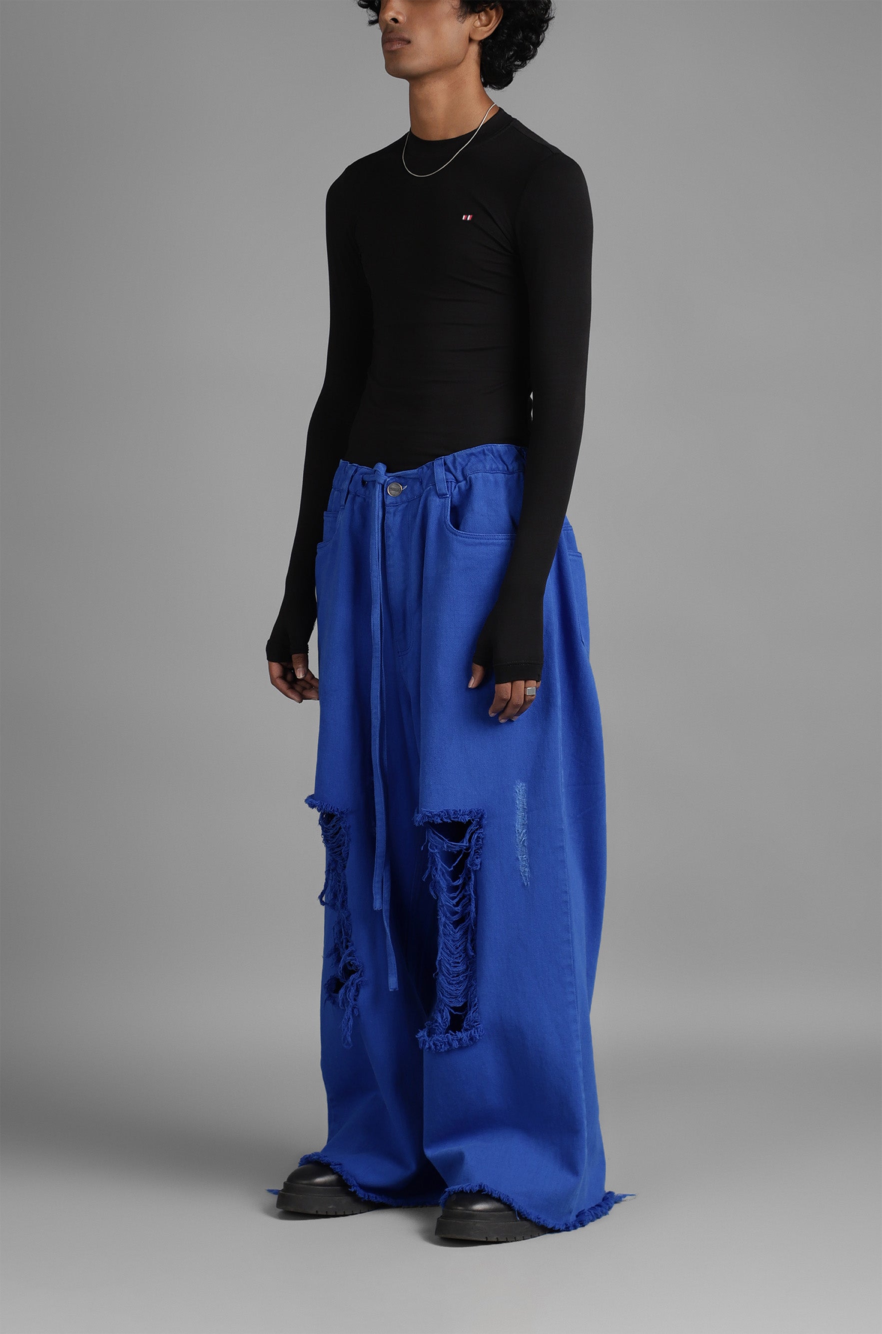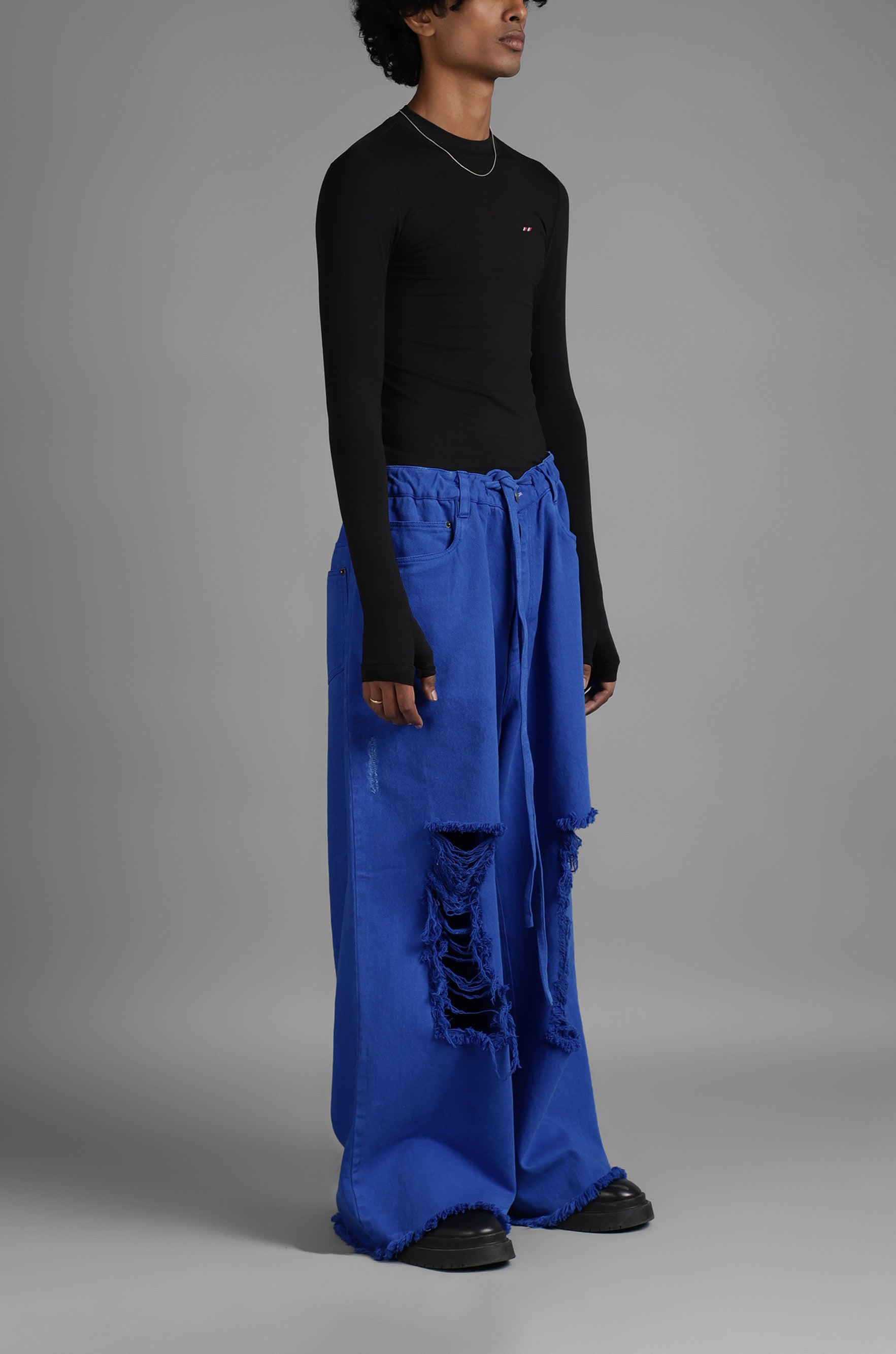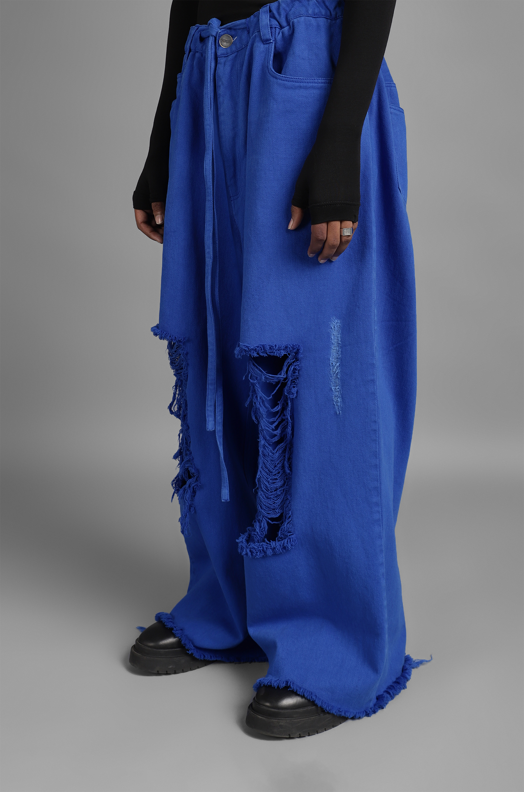 These jeans feature a highly distressed finish and adjustable drawstring waist detailing.