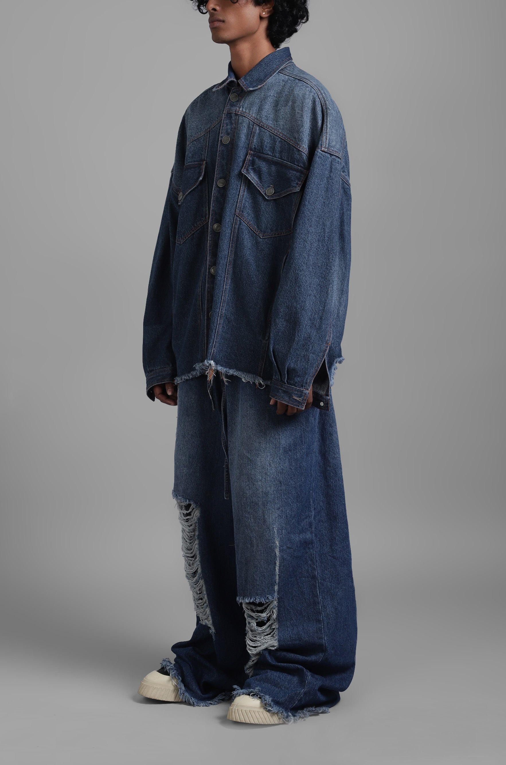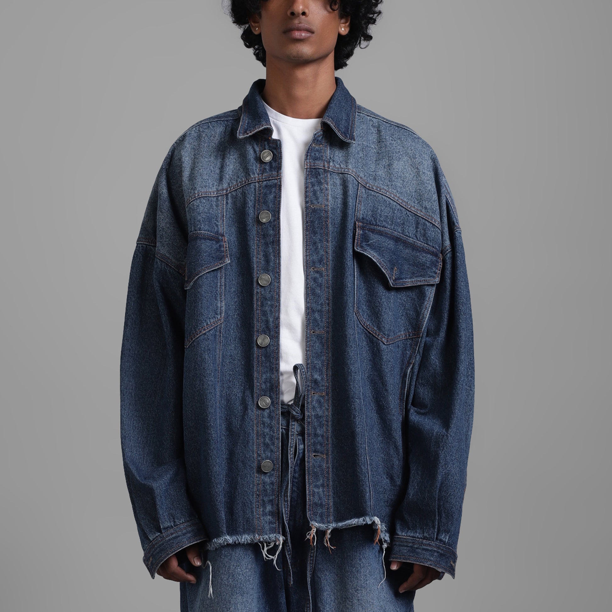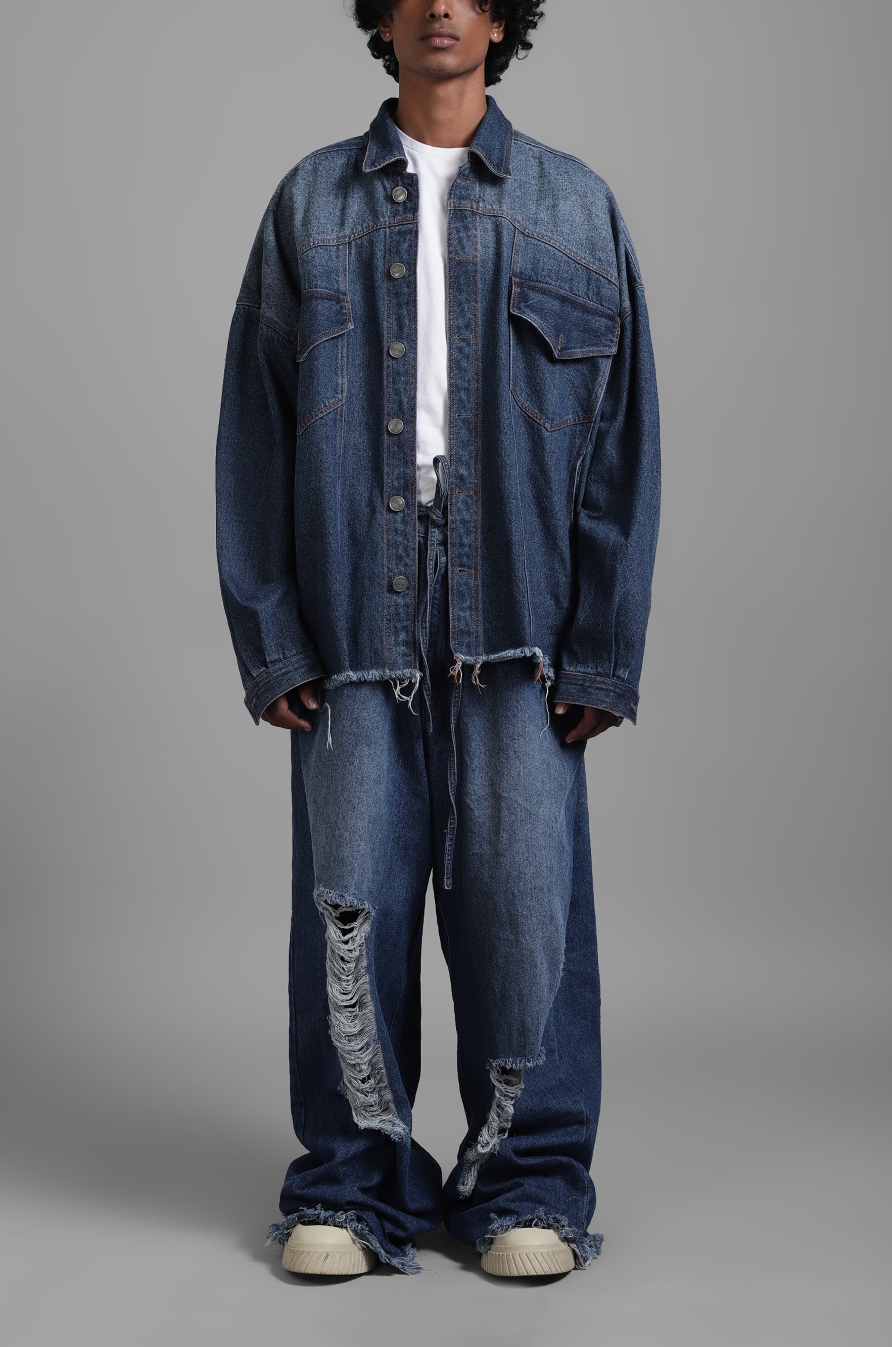 SuperHUEMN Dark Wash Faded Effect Classic Distressed Denim Jacket (Indigo)
