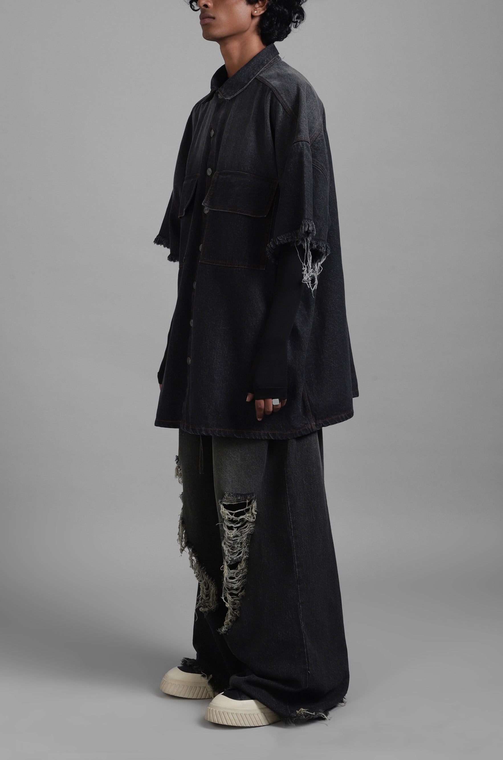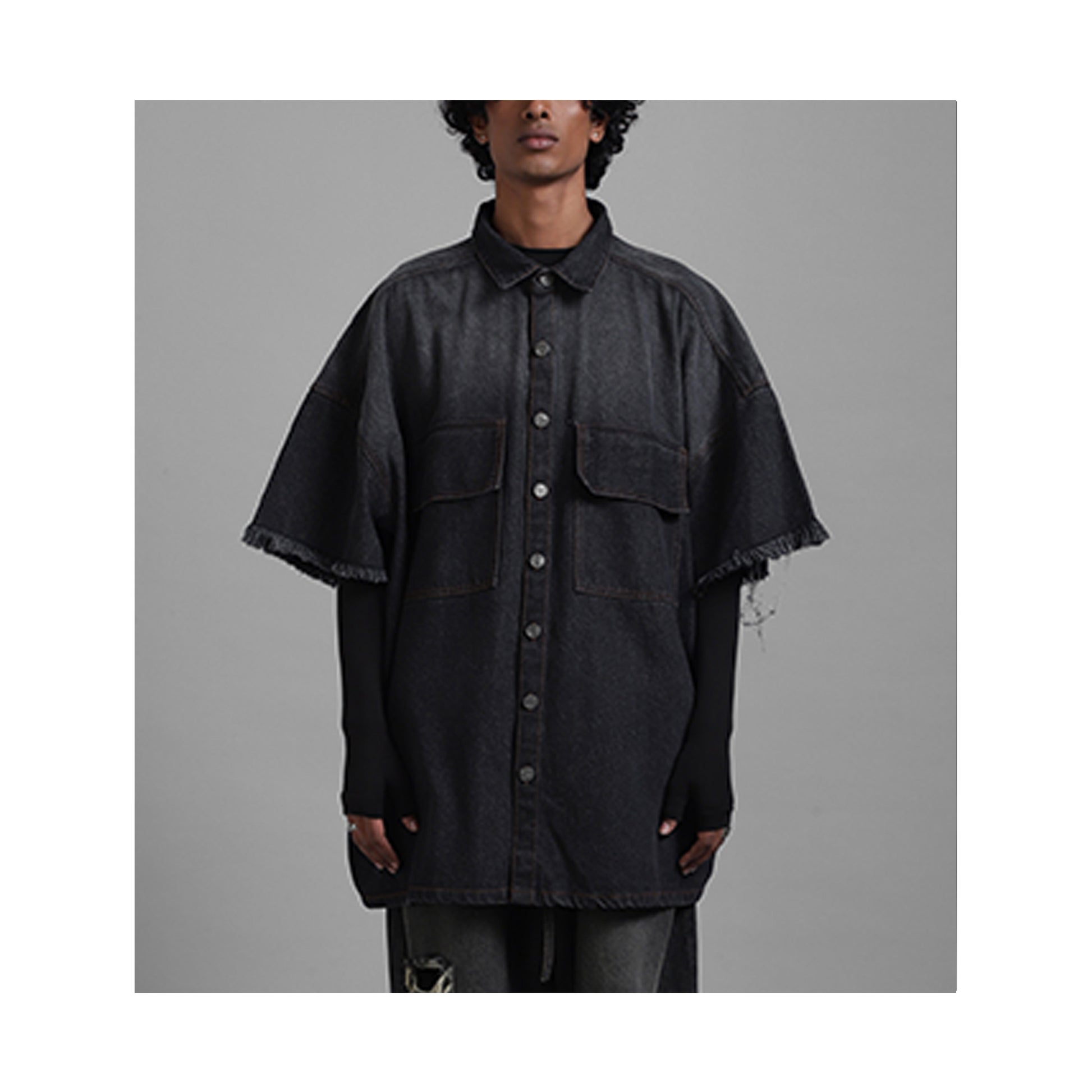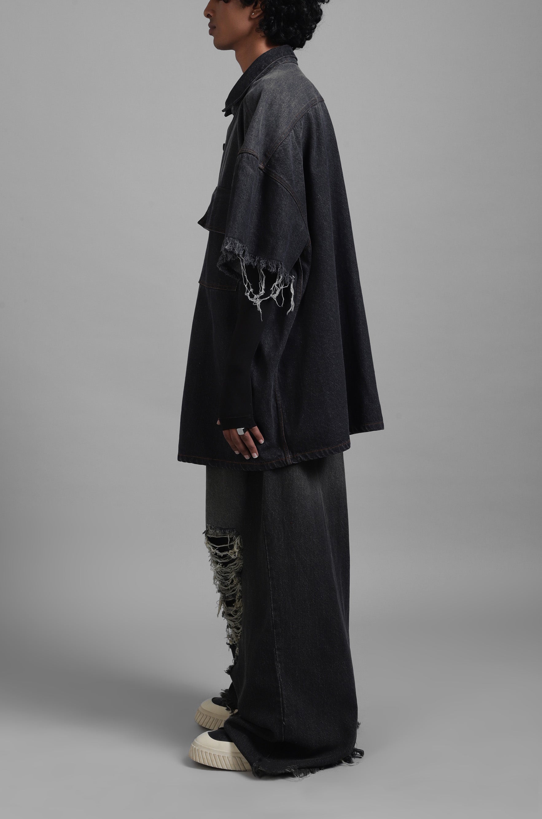 SuperHUEMN Dark Wash Faded Effect Denim Overshirt with Patched Pockets (Black)