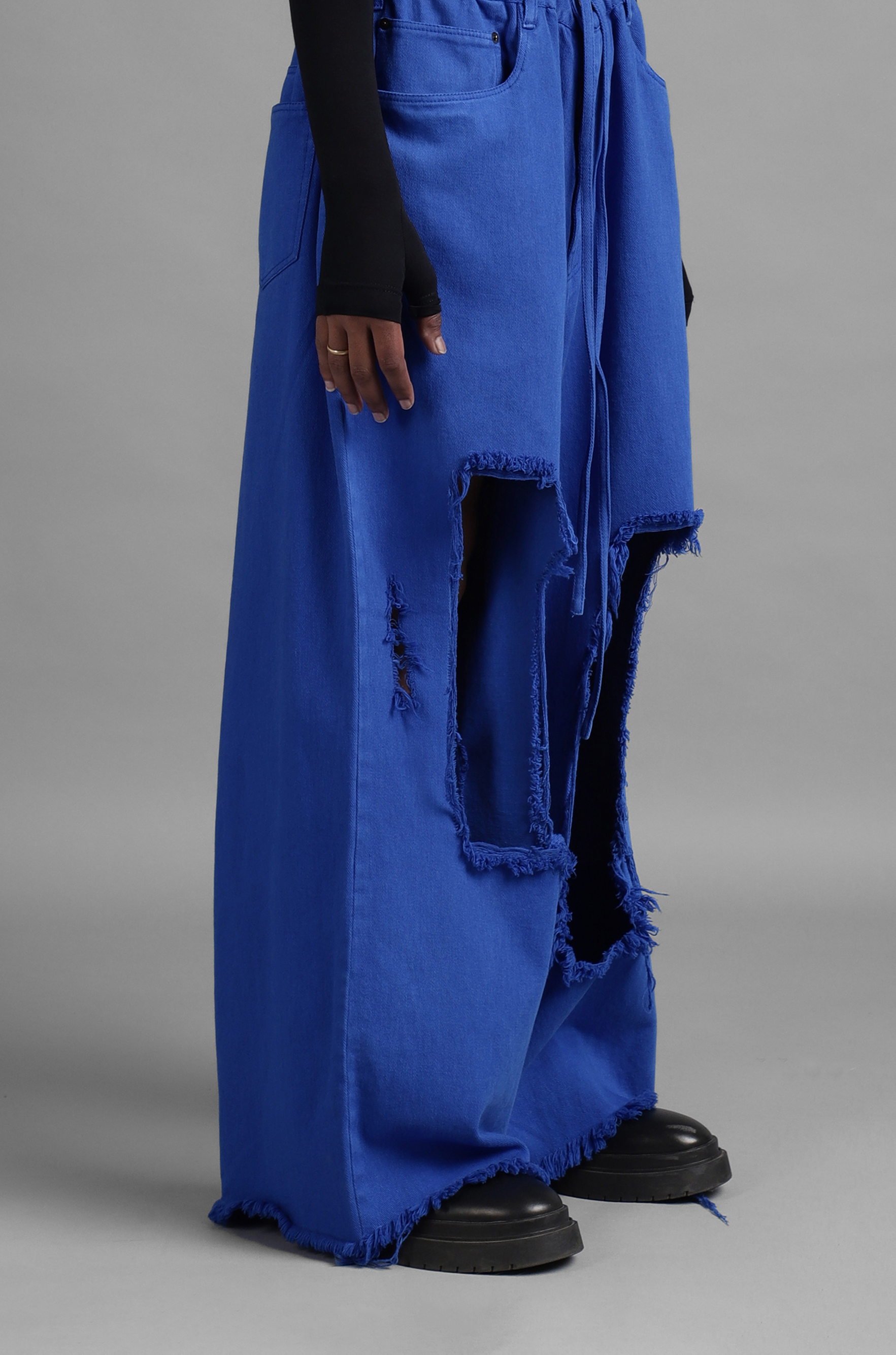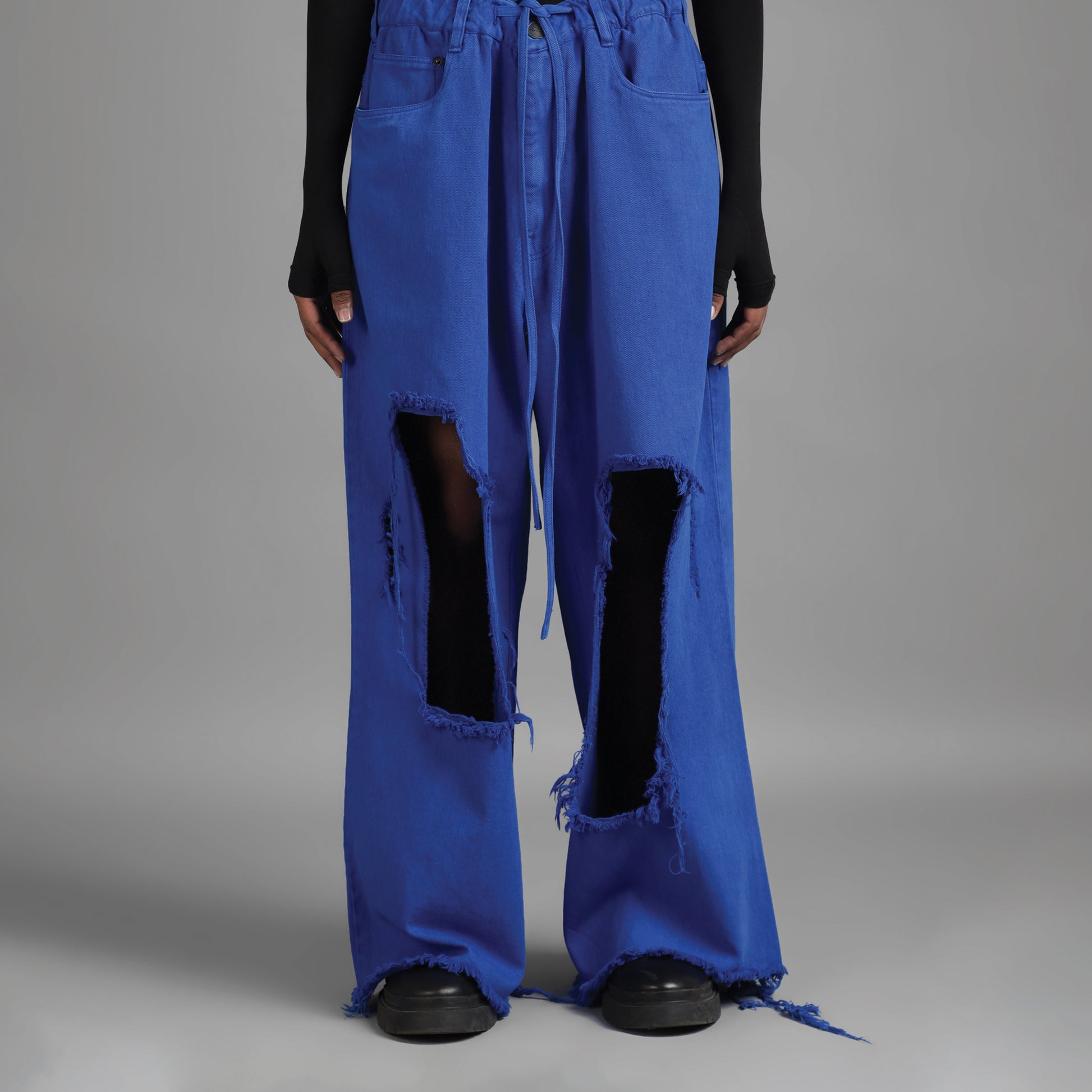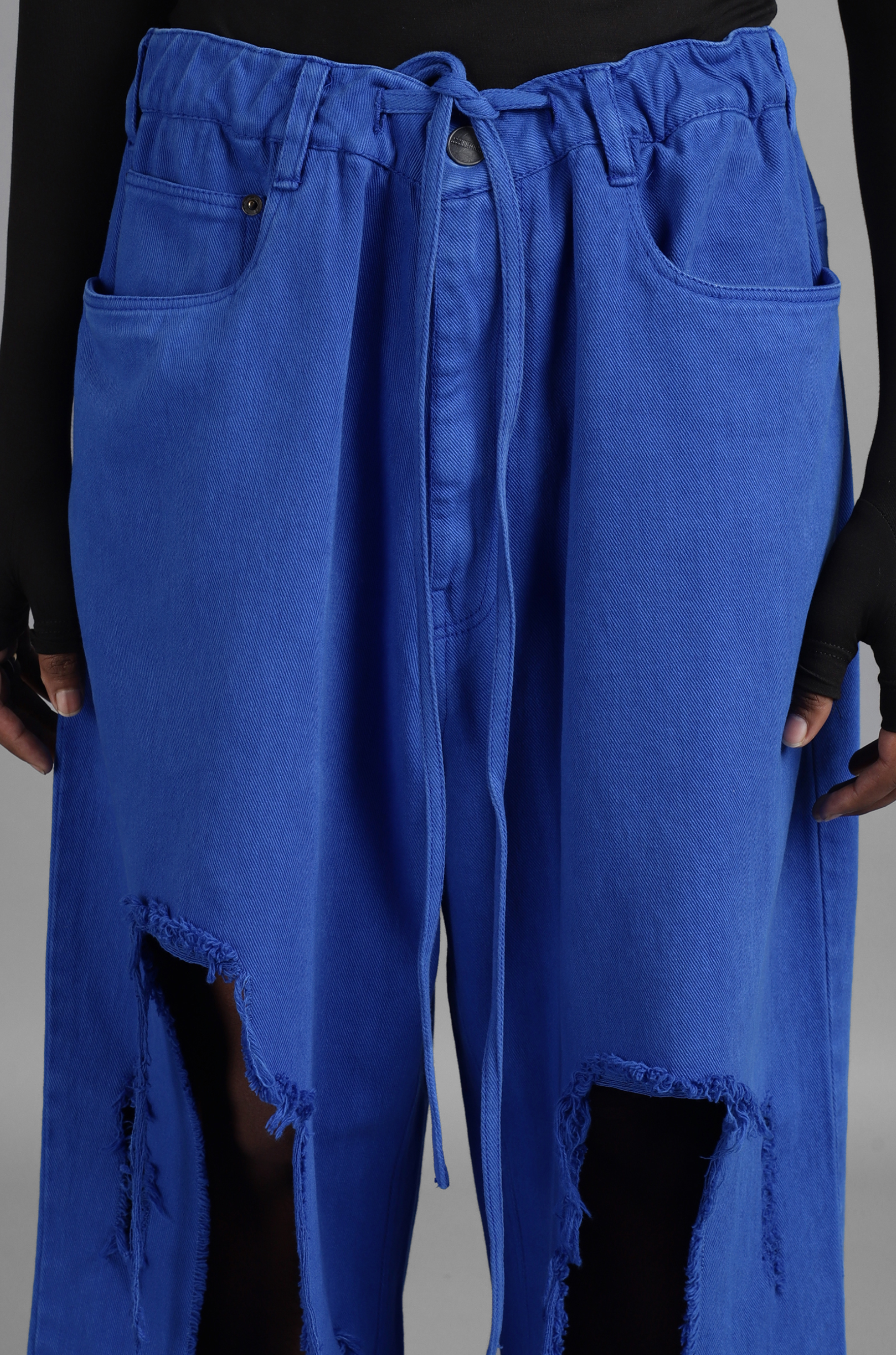 Featuring ripped cutouts and adjustable drawstring waist detailing.