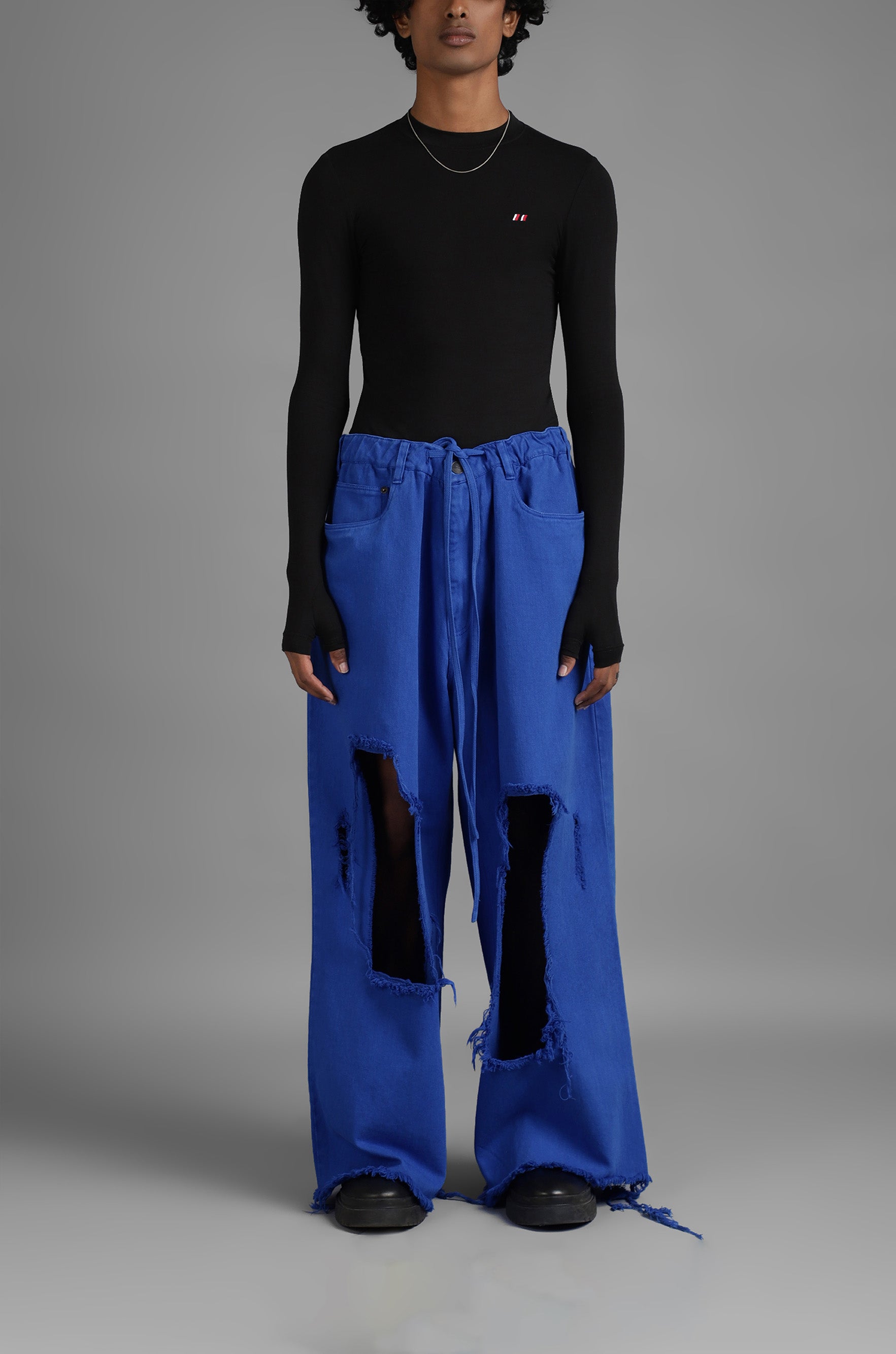 These denim are crafted in an oversized wide-legged silhouette with a dropped crotch for unrestricted movement.