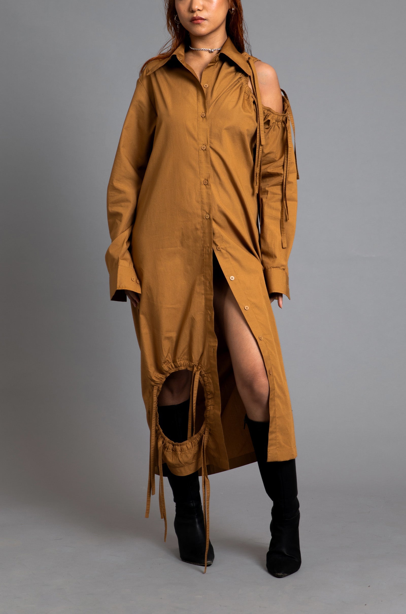 SuperHUEMN 'Sand' Multi-Crater cutout detail shirt dress features a button down shirt dress, with multiple crater - like cutouts and multiple drawstring detailing.