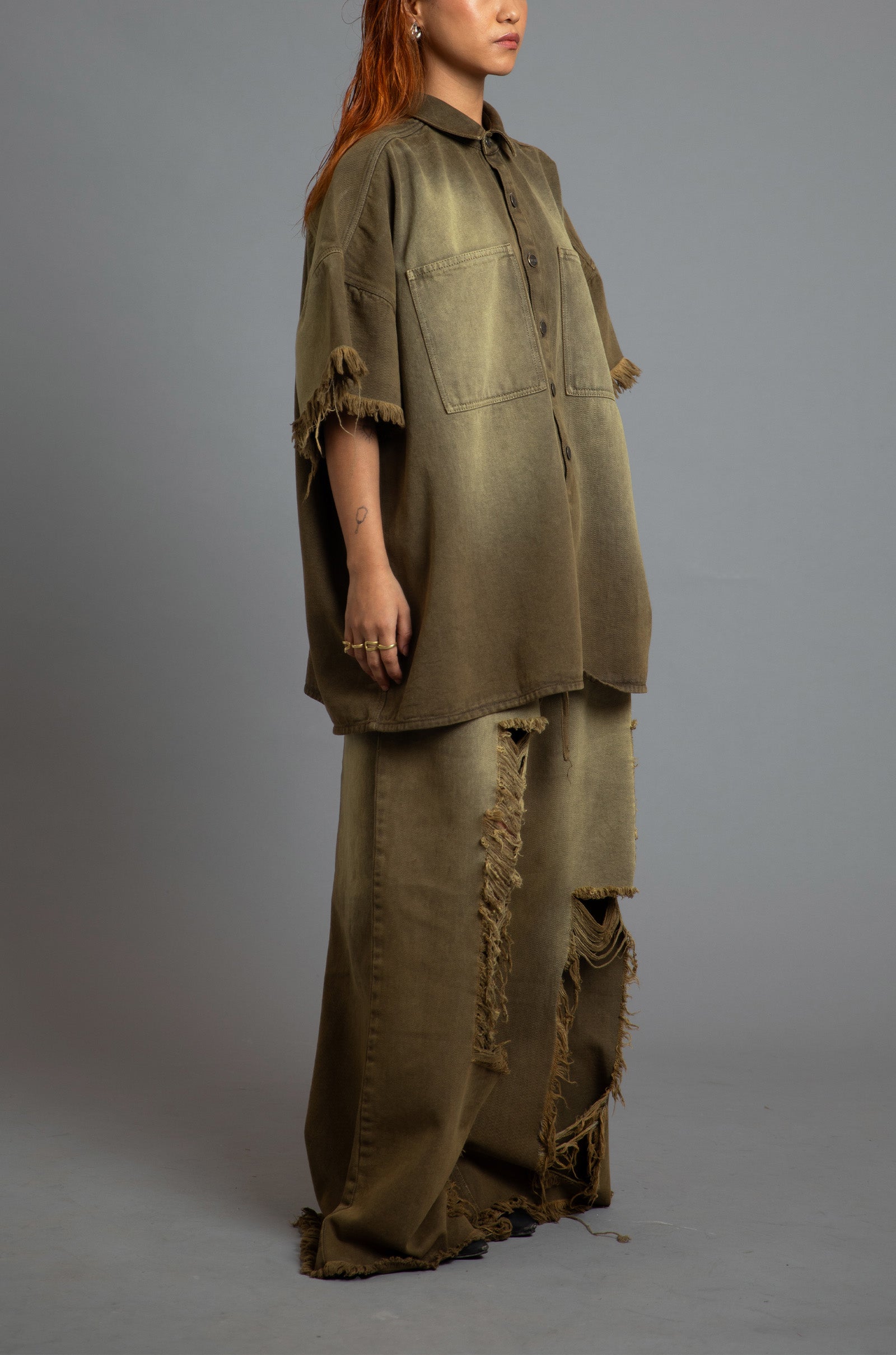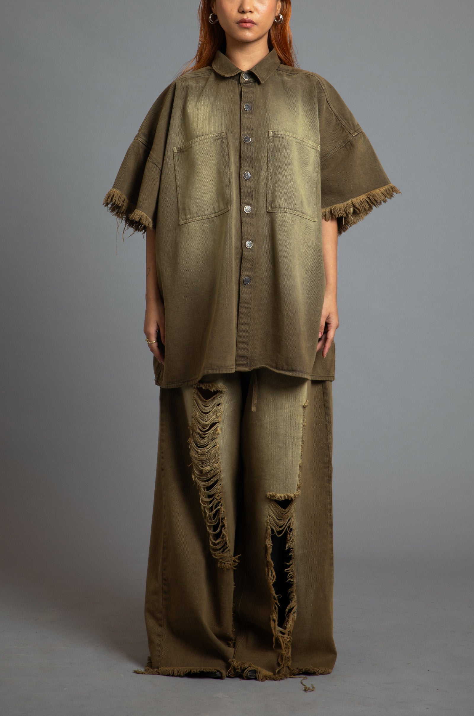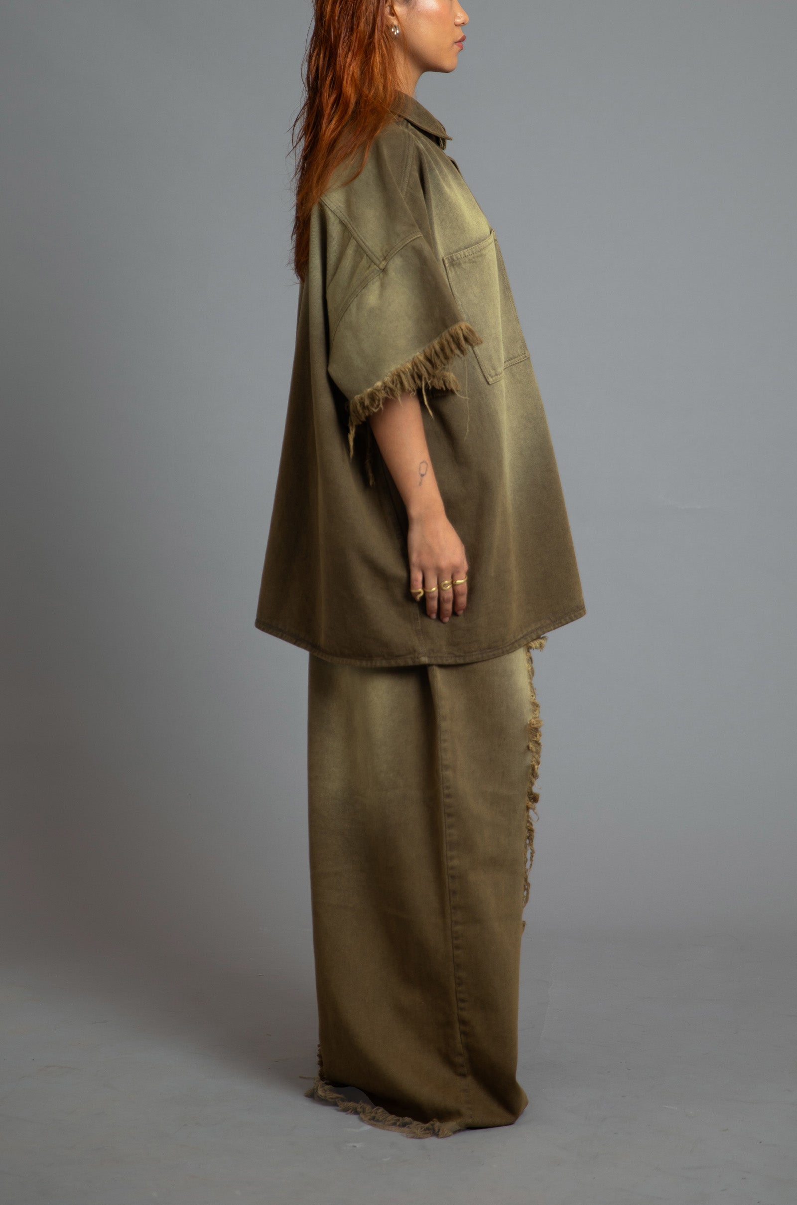 The product features two patched pockets on the front and a raw-edged sleeve and hem detail with a soft sand-like faded finish..