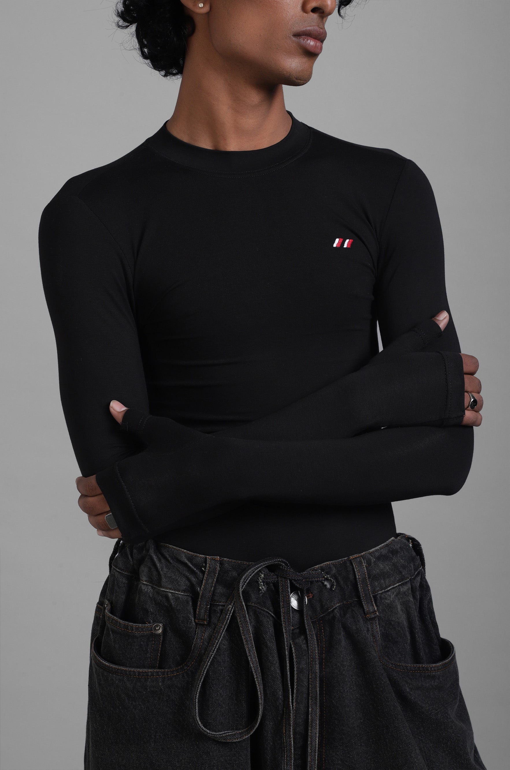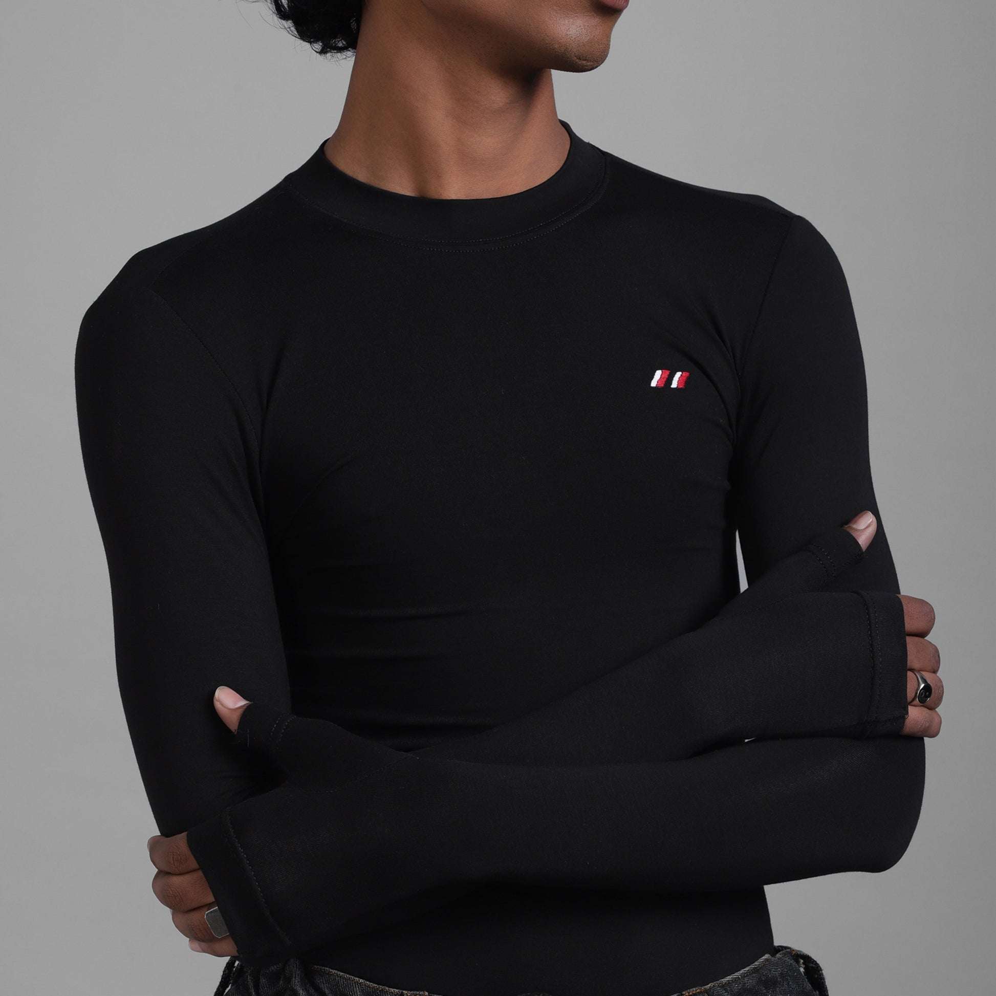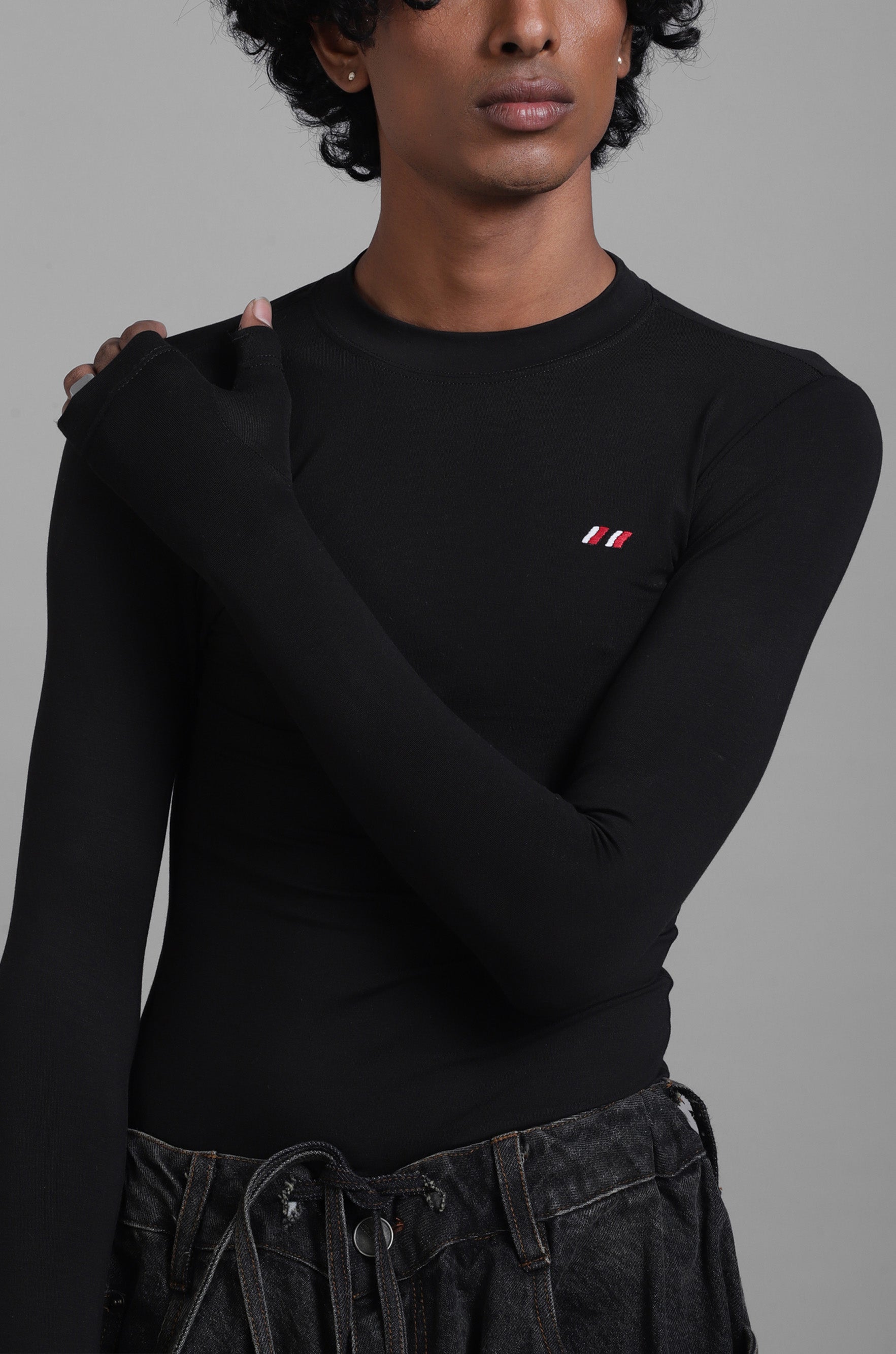 Fitted HUEMN T-shirt in black, featuring a thumb-gloved full-sleeve.