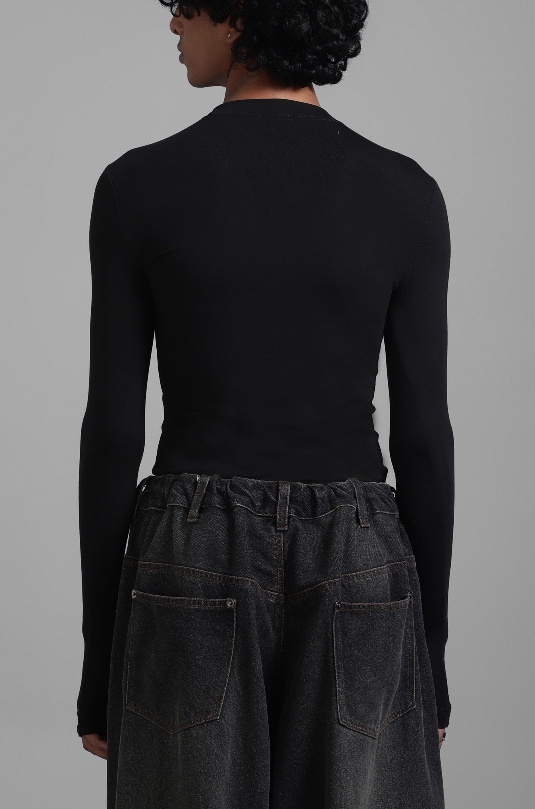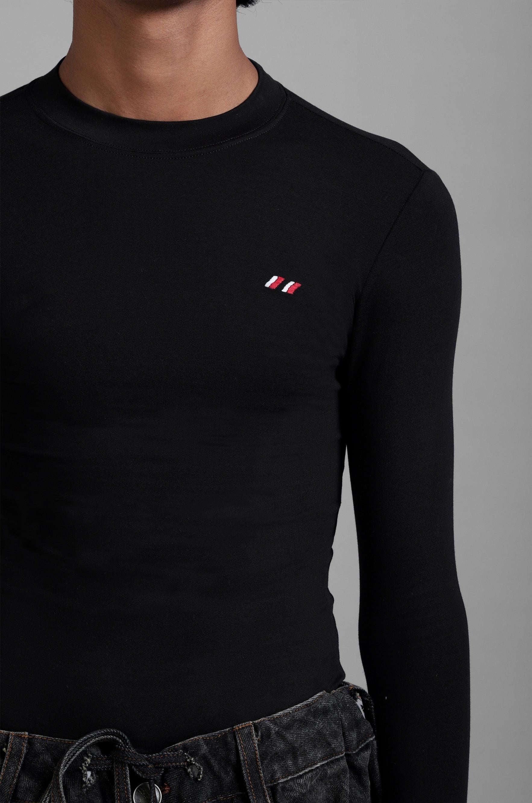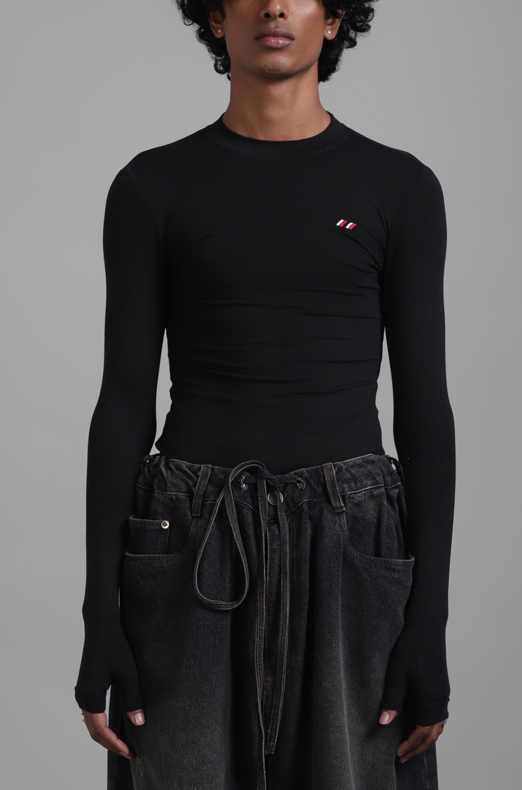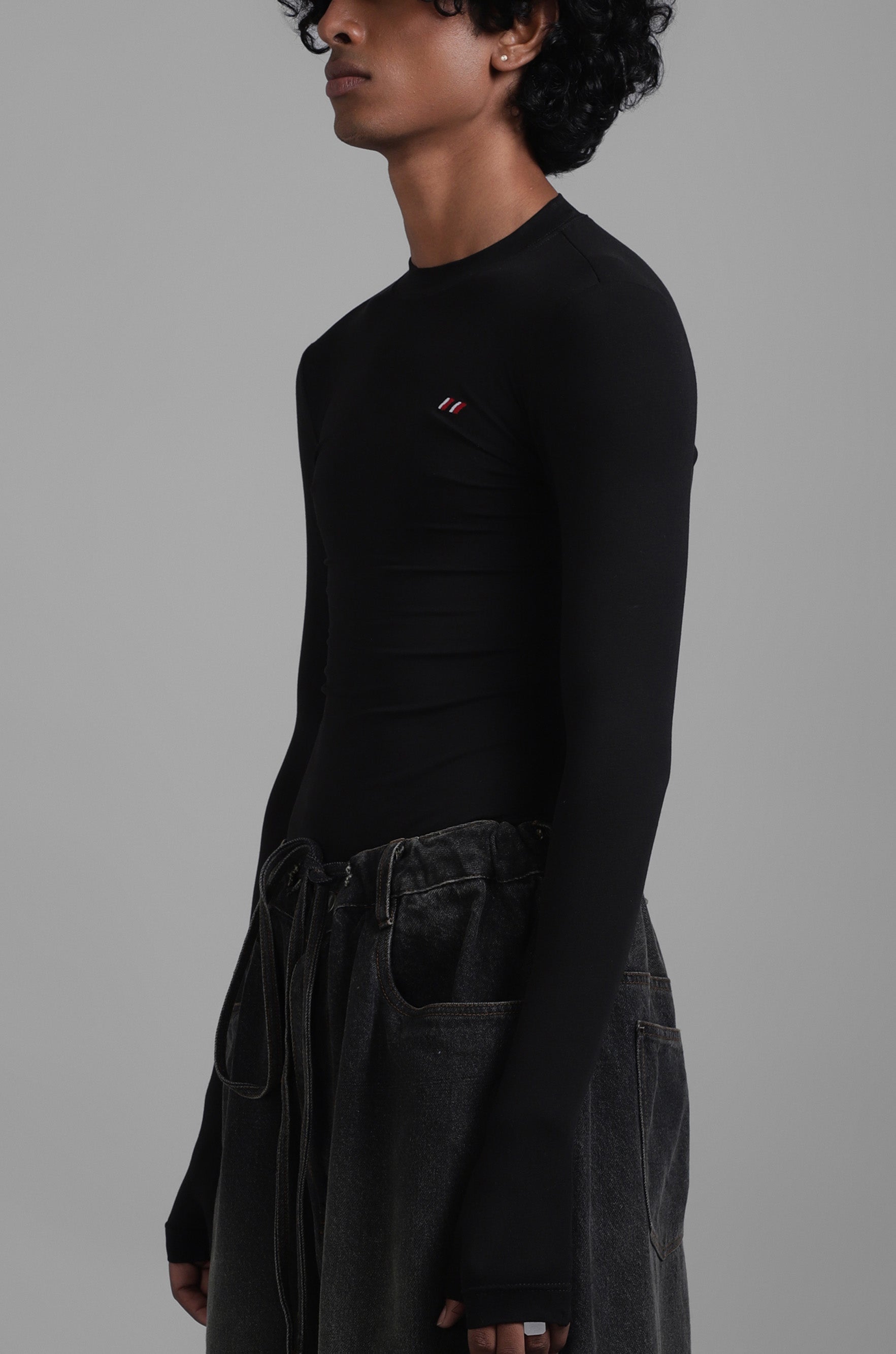 Fitted HUEMN T-shirt in black, featuring a thumb-gloved full-sleeve.