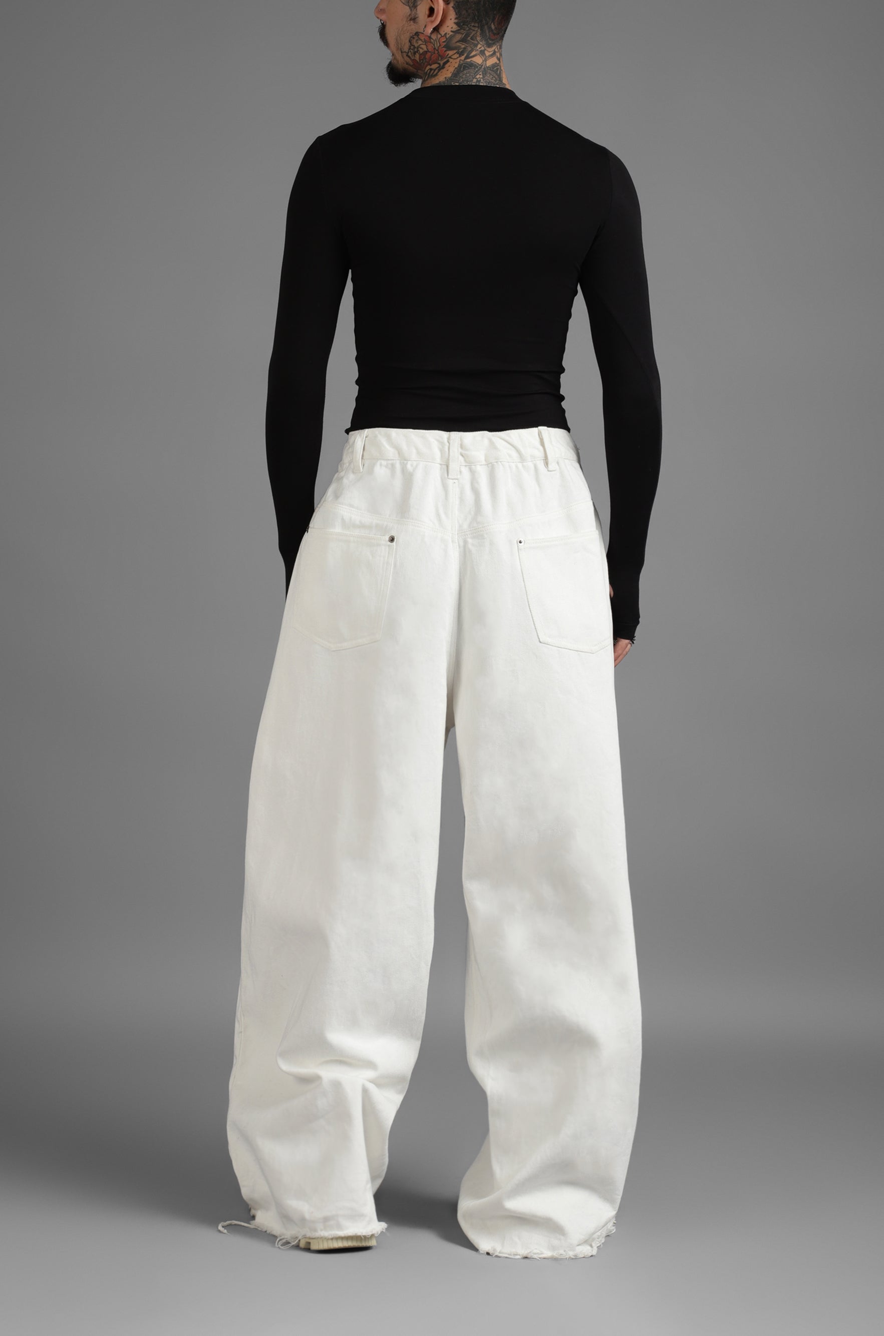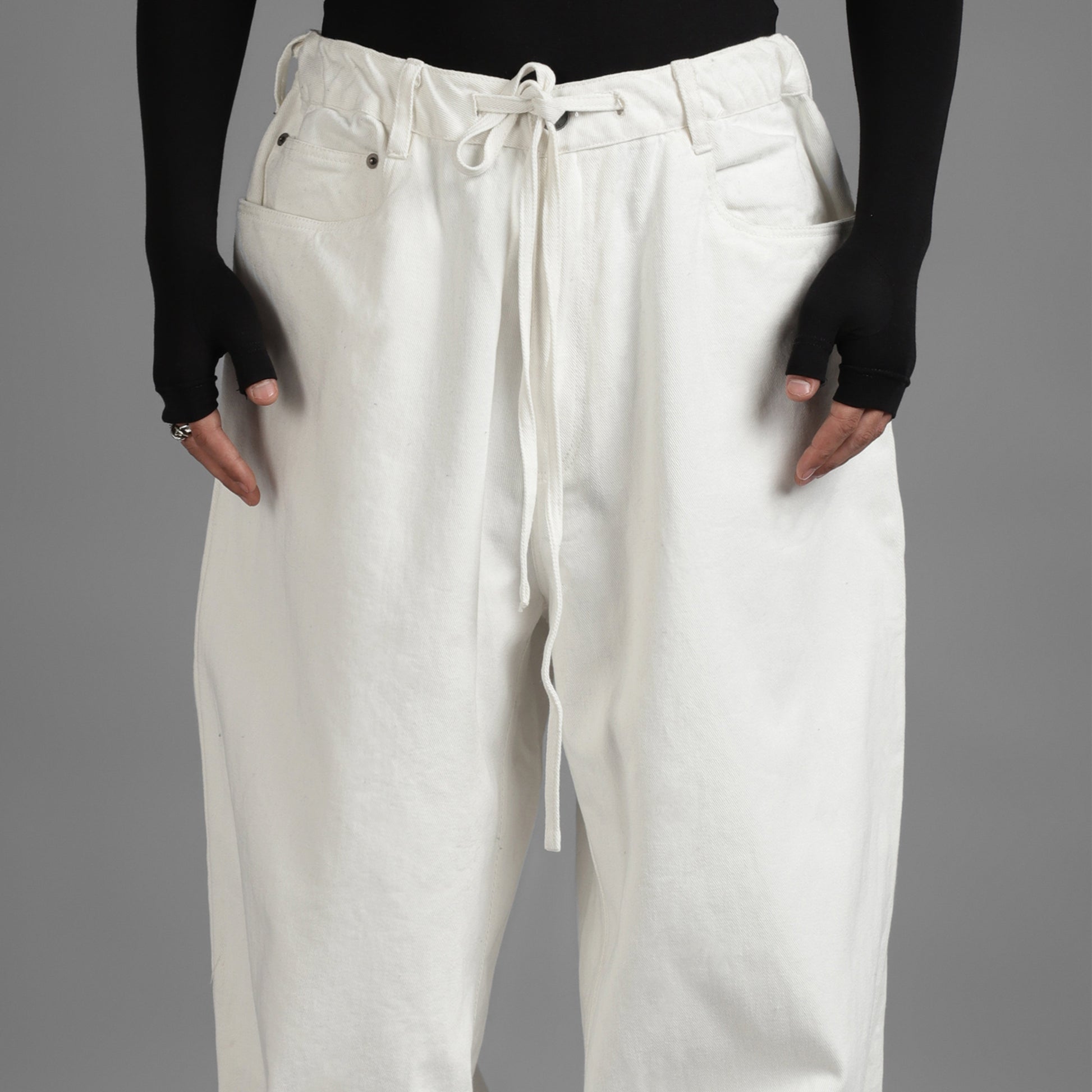 Soft-washed finish with a dropped crotch for unrestricted movement. These jeans feature a raw, distressed hemline detail and an additional adjustable drawstring detailing at the waist.