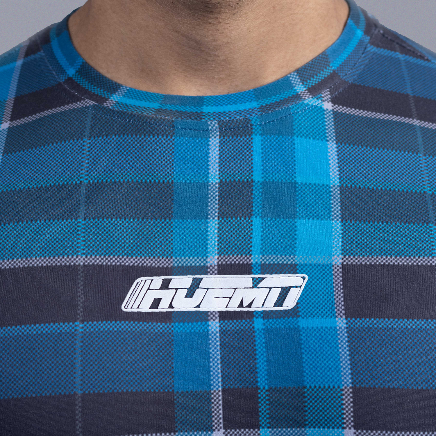 Fitted T-shirt featuring a digitally printed madras check pattern. Finished with a screen-printed 3-D HUEMN 'Racer' logo at the front.