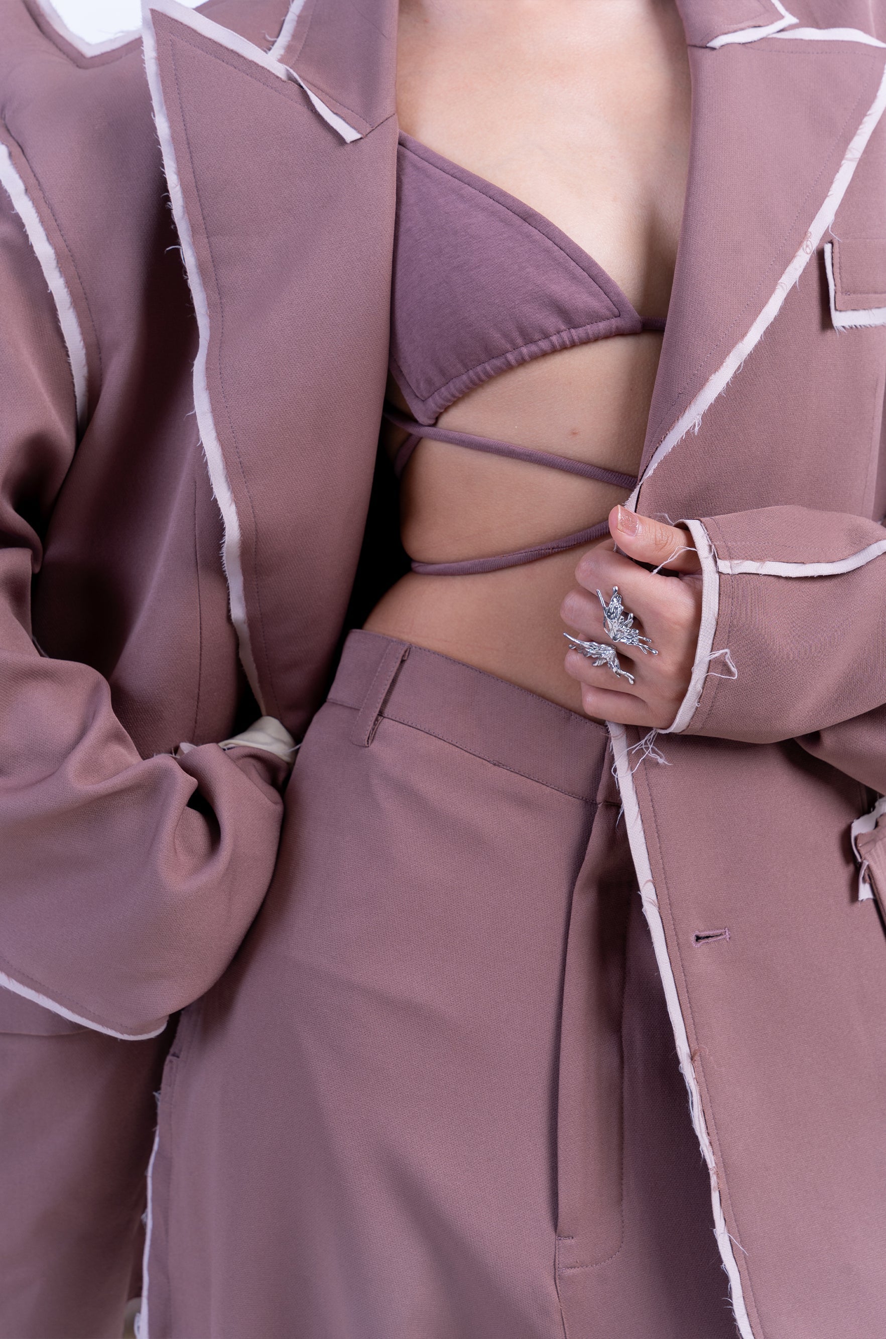Featuring Devil Horns, the HUEMN single-breasted oversized blazer showcases a contrast color raw-edge detailing, notched lapels, and flap pockets. The piece is completed with a back vent.