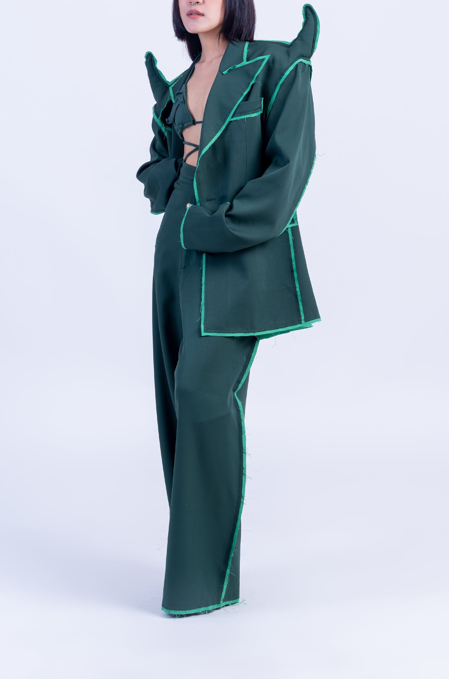 Featuring Devil Horns, the HUEMN single-breasted oversized blazer showcases a contrast color raw-edge detailing, notched lapels, and flap pockets. The piece is completed with a back vent.